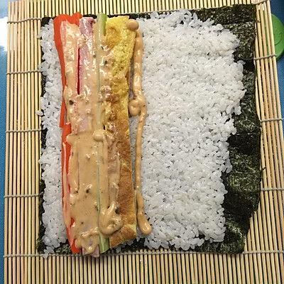 4. 摆放食材:在寿司皮上,依次放上寿司饭、黄瓜条、火腿片等食材。